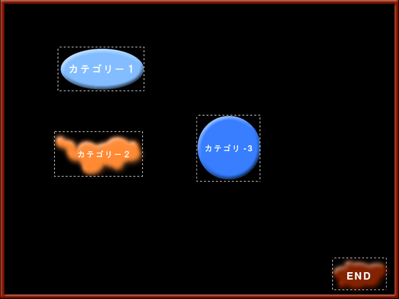 各項目(カテゴリ)や、「END」、「AutoSlide」などのボタンは四角でなくても構いませんが、プログラム上、ボタンを押す範囲の指定は四角となります。下記の画像の点線部分が、ボタンの反応範囲となります。(実際には点線は画面に表示されることはありません。)