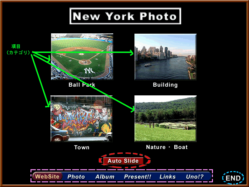 各項目(カテゴリ)や、「END」、「AutoSlide」などのボタンは四角でなくても構いませんが、プログラム上、ボタンを押す範囲は四角となります。詳しくはこちら |